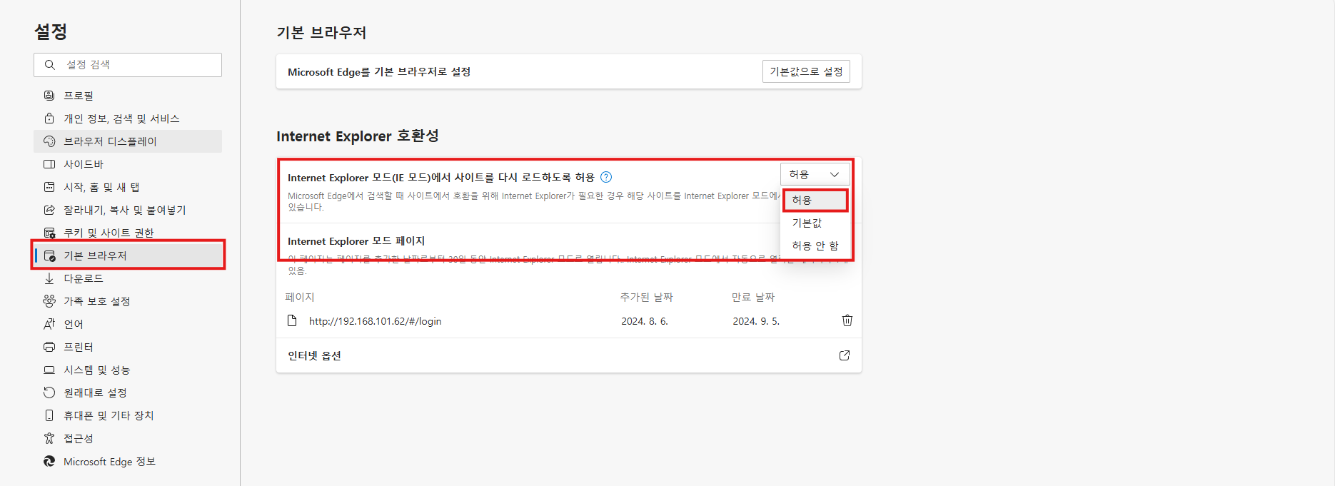 IEMode를 허용으로 바꿉니다!